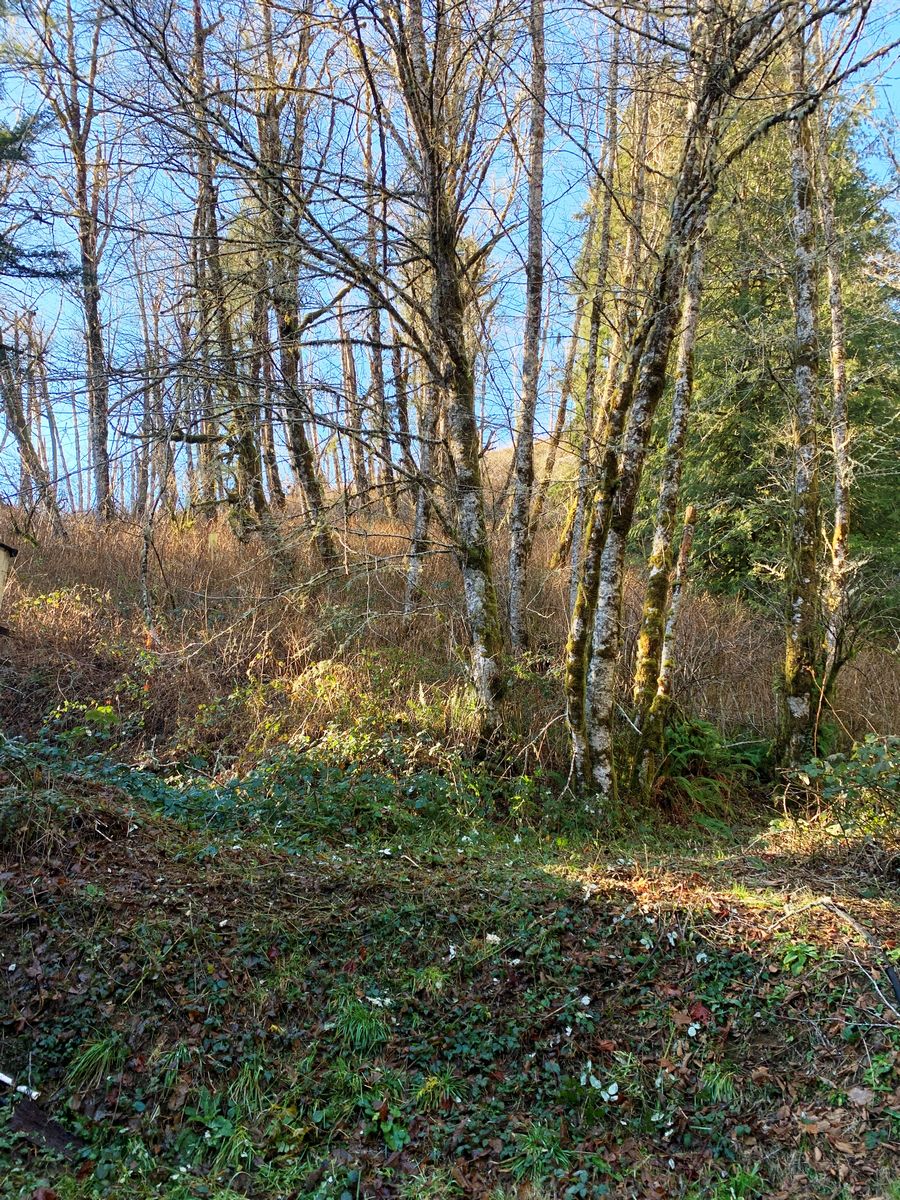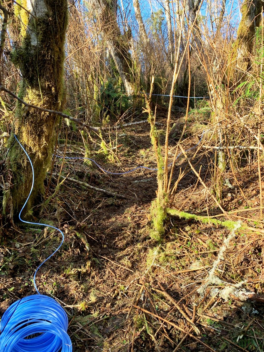 As we have had a number of below freezing nights, I figured it was time to run some Alder sap lines. This trial was using Red Alder trees above the house as seen in the center pic below. The tubing and pliers in the first pic were a gift from Professor Eric Jones of OSU. He was kind enough to stop by and discuss starting shiitake on Alder logs along with a demo of using tubes to tap Alder trees for syrup. As the hillside above is totally covered with salmonberry bushes, this required clearing a path up the hill before I even considered running any tubing. Although still a sweat producing chore and a steep uphill battle, my weed whacker with a steel 12" brush cutter that has two downward facing blades or teeth. A couple hours on two different days got it done. I then had to determine the path between the existing (and live) Alder trees to run the tubing. That added another couple hours of clearing, but it was eventually complete. I now have 19 mature Alder trees on the line.