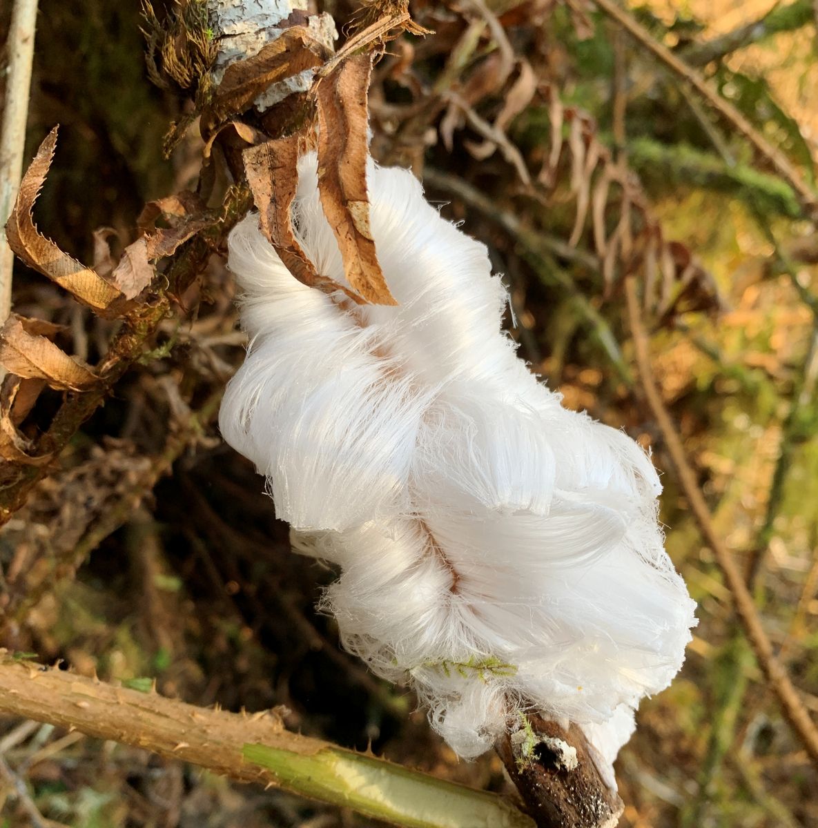 Besides finding a downed Alder branch with a lot of beautiful Turkey Tail mushrooms growing from it, I also came across a couple spots of "hair ice", produced by the fungus Exidiopsis effusa. Not overly rare out here, but I only tend to spot it maybe every other year or so. And of course, that's only if I'm out in the woods in below freezing temps.