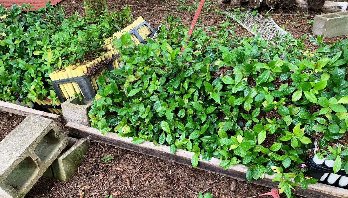 The rack of tea plants that I had mentioned before, finally collapsed enough that they needed repaired. I decided to relocate them to the orchard under the Sitka spruce trees.