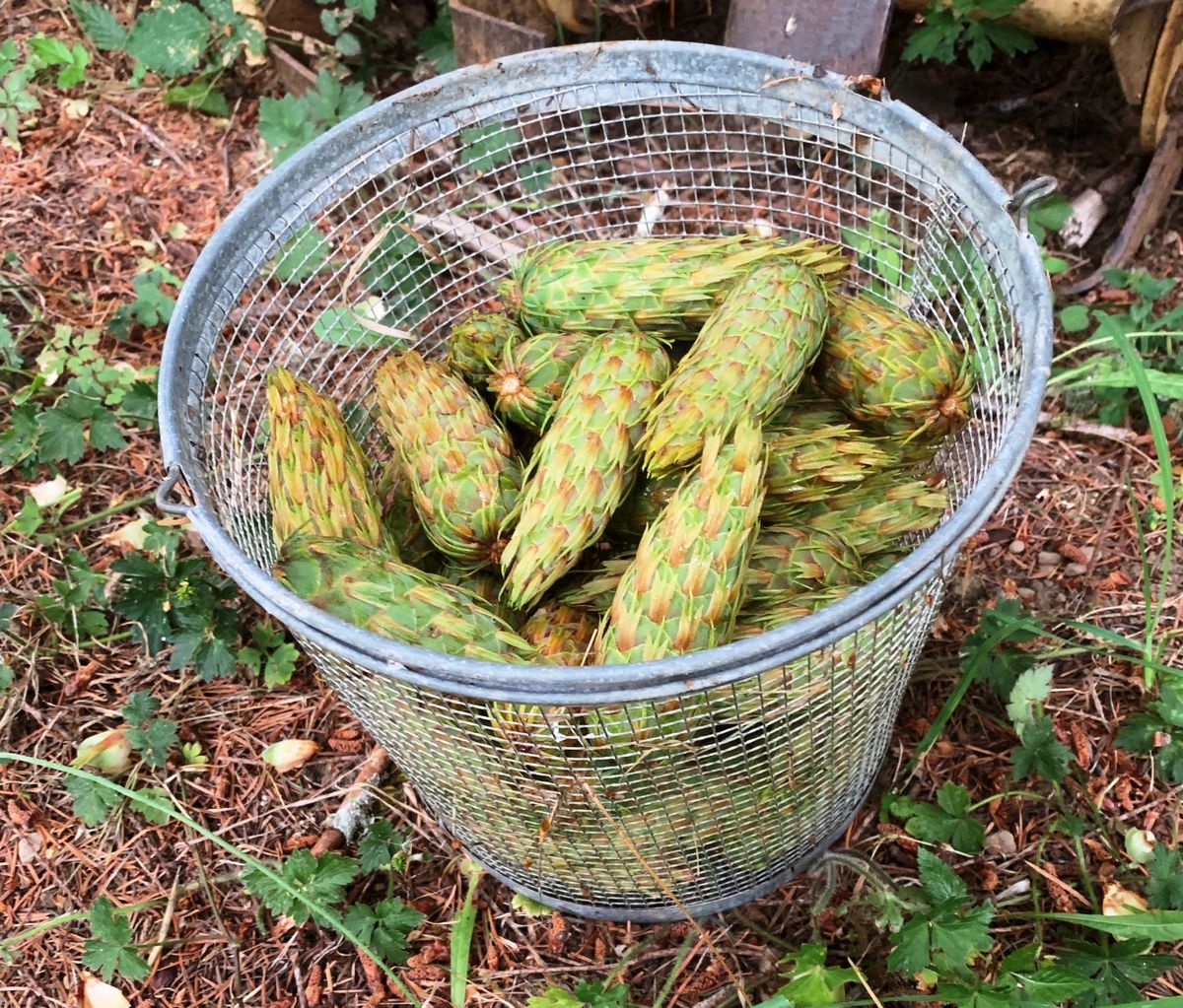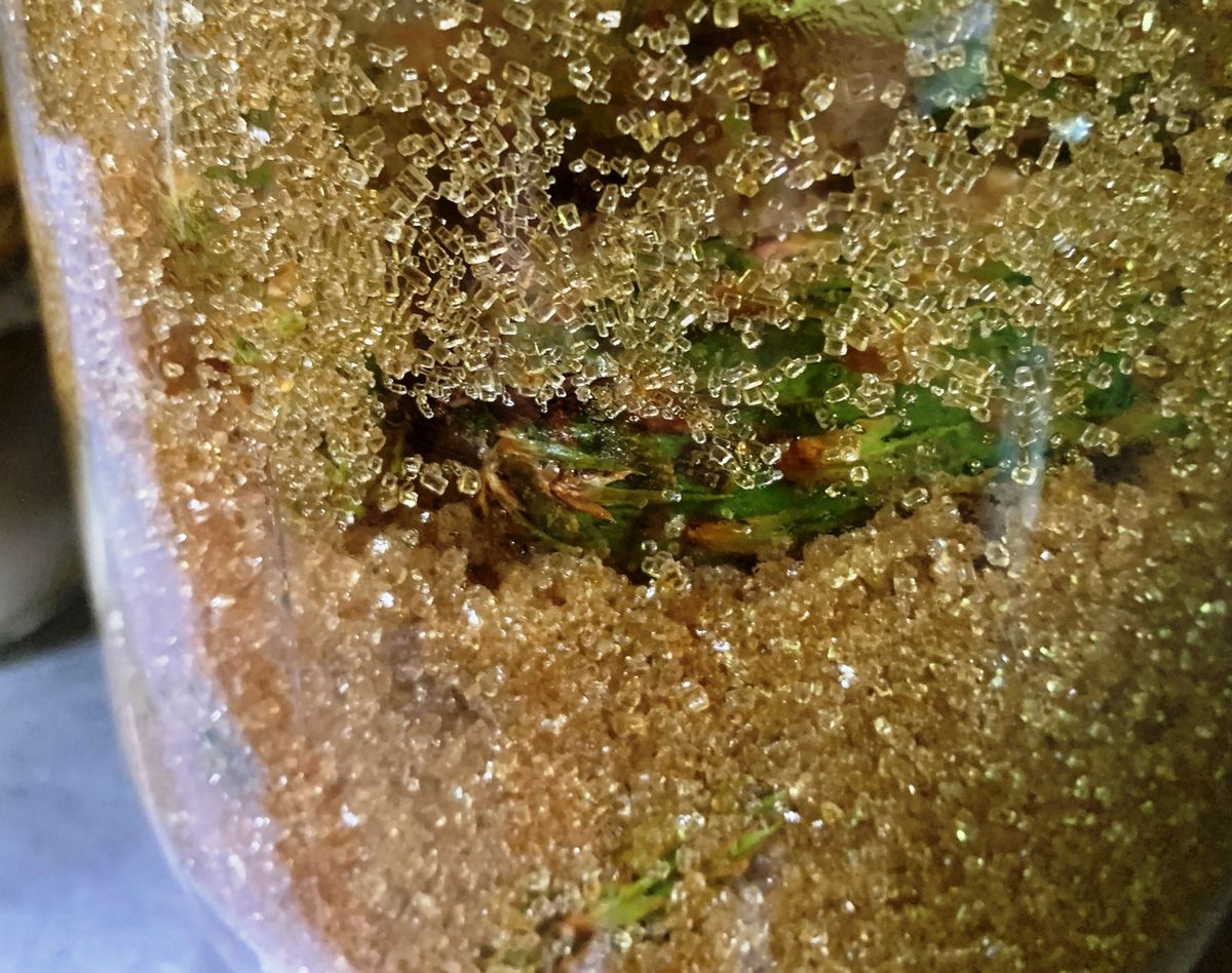 We had a nuisance squirrel start cutting off and tossing down Douglas Fir cones. I really think it did try to bounce them off our heads! As they were right in the middle of the path to the orchard gate, I collected up some of them as we were slipping and tripping over them. And, as the constant rain of cones showed no signs of slowing down that afternoon, I decided to try to find out for what they might be useful. It took very little time to read about Mugolio. The artisanal Italian syrup apparently became popular in Europe where it was produced from the Mugo pine in the Alps. And it is a rather expensive commodity. But there were numerous articles about people using other types of pine cones to make syrup by a similar method. All it takes are green cones and sugar and time. The sugar pulls moisture from the cones and then ferments a bit over several, to many, months to make an unusual syrup. So, of course, I had to try that! I eventually picked some of the still green cones from the squirrel's bounty and tossed them in organic sugar (right pic).