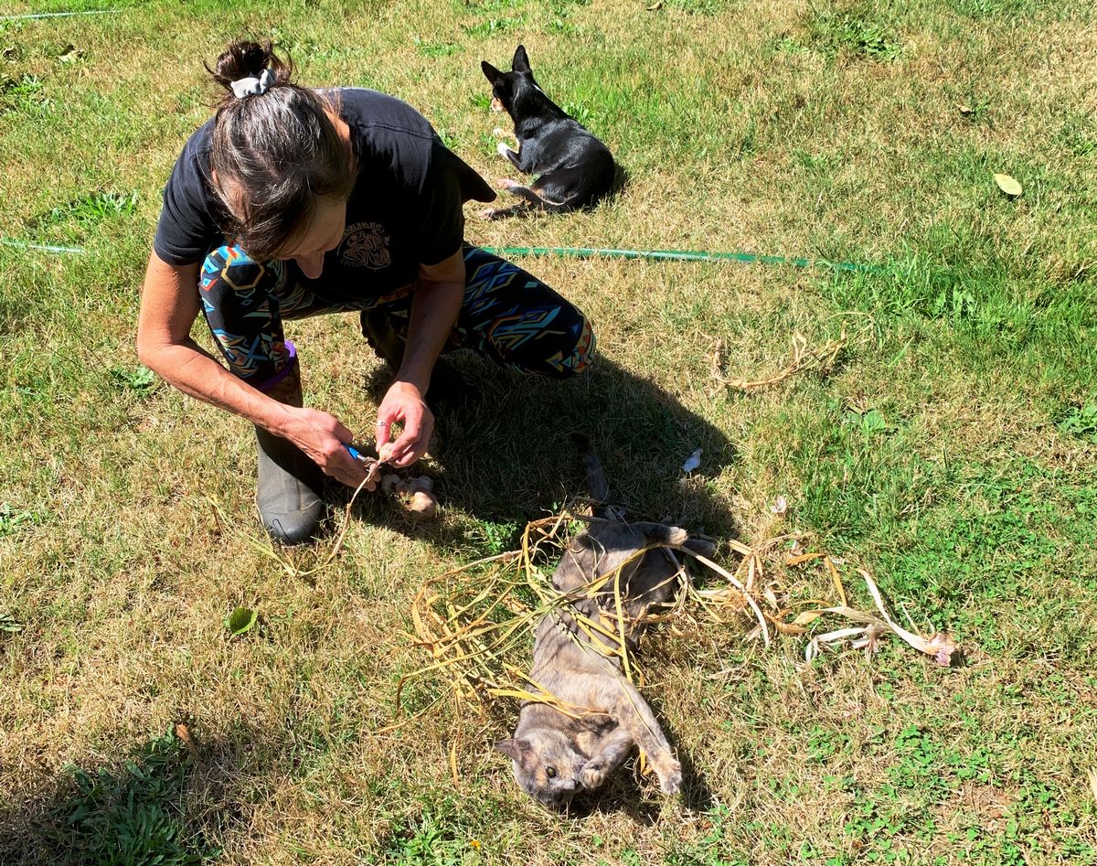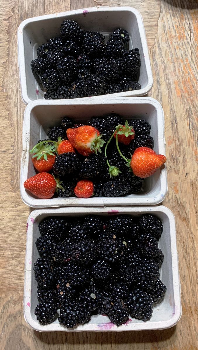 Just a quick pic showcase of harvesting some of the black elderberries from the covered bush in the orchard, Steph cleaning the garlic (with a lot of help from the cat!), some drying calendula flowers, and some more blue, black and strawberries.