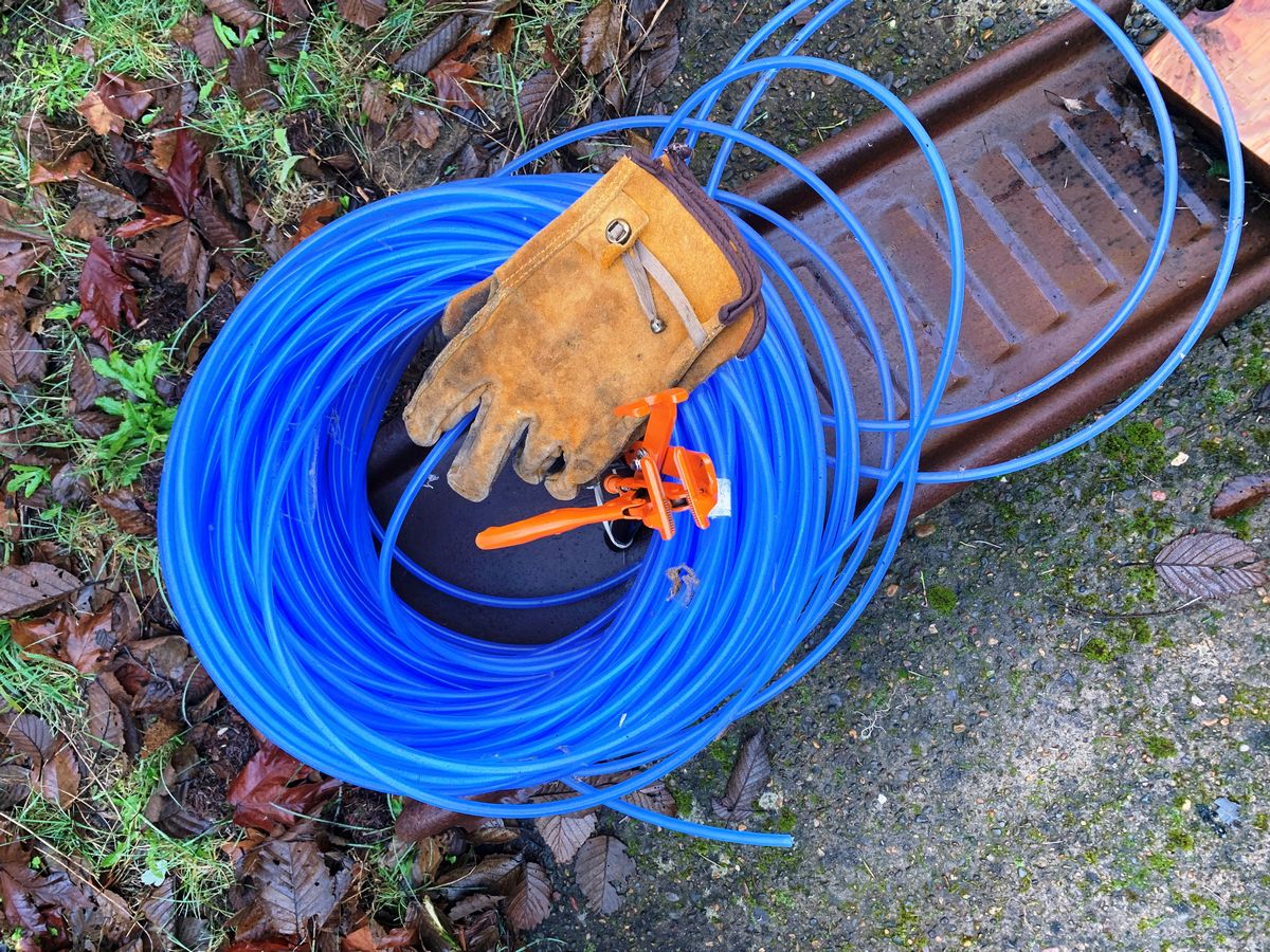 As we have had a number of below freezing nights, I figured it was time to run some Alder sap lines. This trial was using Red Alder trees above the house as seen in the center pic below. The tubing and pliers in the first pic were a gift from Professor Eric Jones of OSU. He was kind enough to stop by and discuss starting shiitake on Alder logs along with a demo of using tubes to tap Alder trees for syrup. As the hillside above is totally covered with salmonberry bushes, this required clearing a path up the hill before I even considered running any tubing. Although still a sweat producing chore and a steep uphill battle, my weed whacker with a steel 12" brush cutter that has two downward facing blades or teeth. A couple hours on two different days got it done. I then had to determine the path between the existing (and live) Alder trees to run the tubing. That added another couple hours of clearing, but it was eventually complete. I now have 19 mature Alder trees on the line.