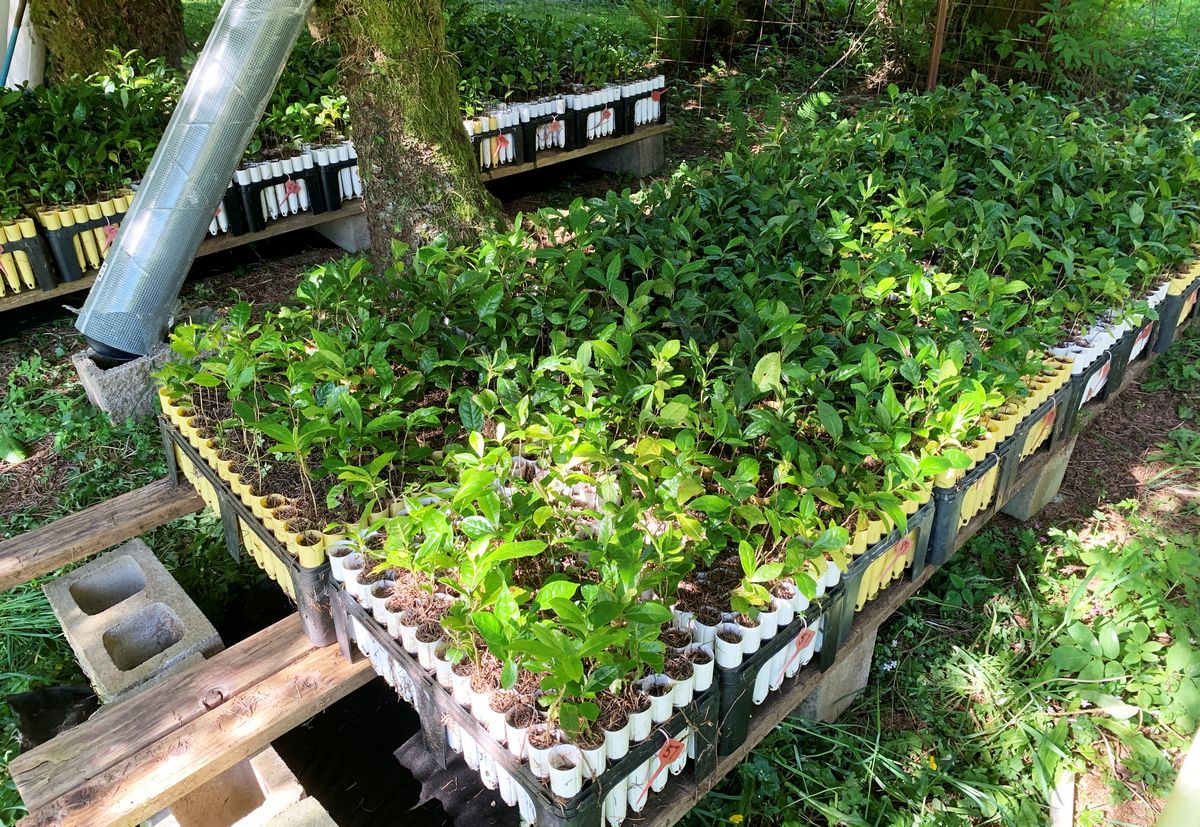 The rack of tea plants that I had mentioned before, finally collapsed enough that they needed repaired. I decided to relocate them to the orchard under the Sitka spruce trees.