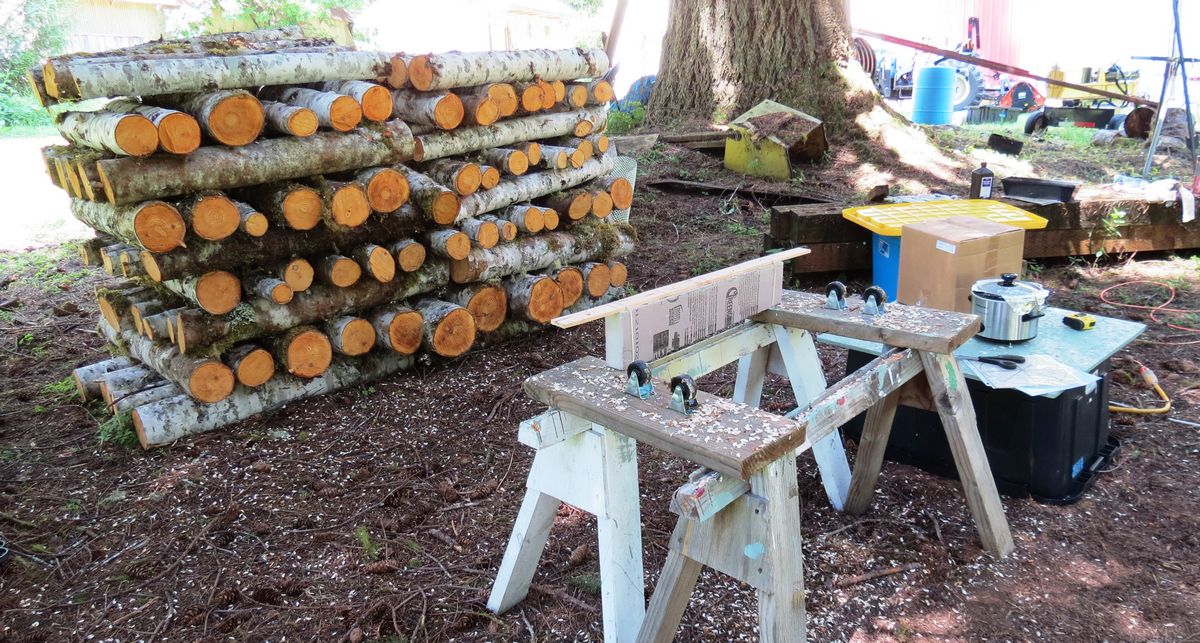 The inoculation setup is pretty basic, but I managed to get them all drilled, plugged with shiitake sawdust spawn, waxed over, and re-stacked with tags indicating the strain of spawn used.