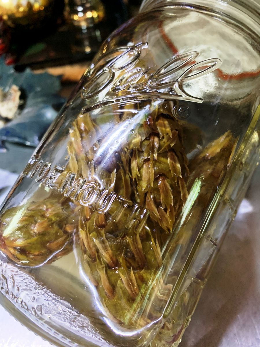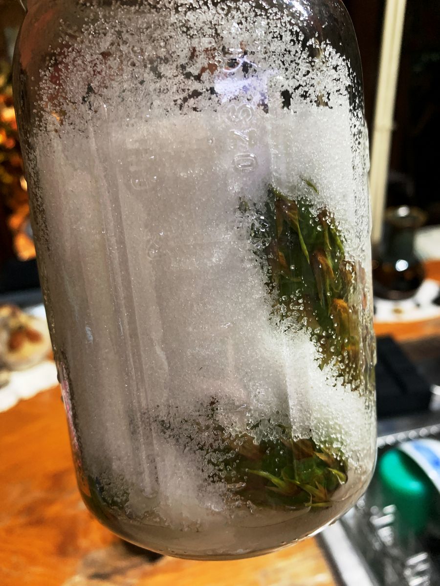 We had a nuisance squirrel start cutting off and tossing down Douglas Fir cones. I really think it did try to bounce them off our heads! As they were right in the middle of the path to the orchard gate, I collected up some of them as we were slipping and tripping over them. And, as the constant rain of cones showed no signs of slowing down that afternoon, I decided to try to find out for what they might be useful. It took very little time to read about Mugolio. The artisanal Italian syrup apparently became popular in Europe where it was produced from the Mugo pine in the Alps. And it is a rather expensive commodity. But there were numerous articles about people using other types of pine cones to make syrup by a similar method. All it takes are green cones and sugar and time. The sugar pulls moisture from the cones and then ferments a bit over several, to many, months to make an unusual syrup. So, of course, I had to try that! I eventually picked some of the still green cones from the squirrel's bounty and tossed them in organic sugar (right pic).