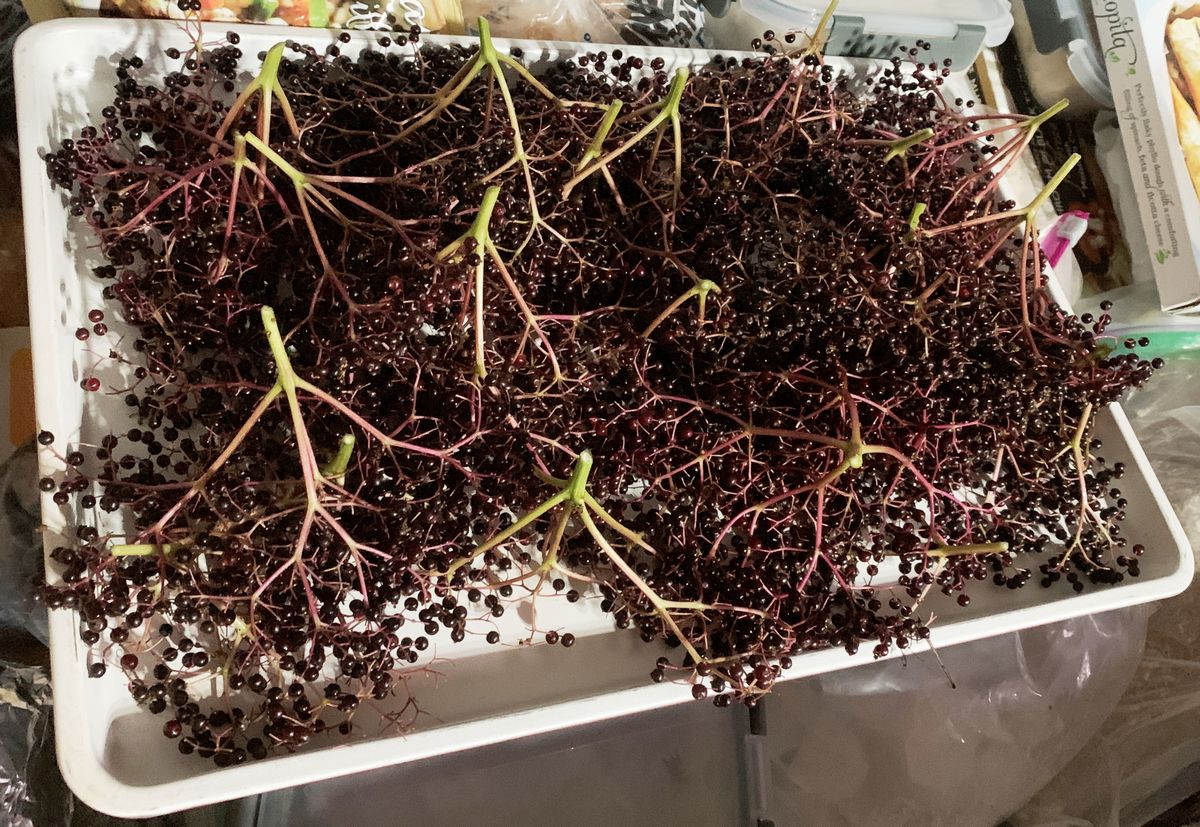 Just a quick pic showcase of harvesting some of the black elderberries from the covered bush in the orchard, Steph cleaning the garlic (with a lot of help from the cat!), some drying calendula flowers, and some more blue, black and strawberries.